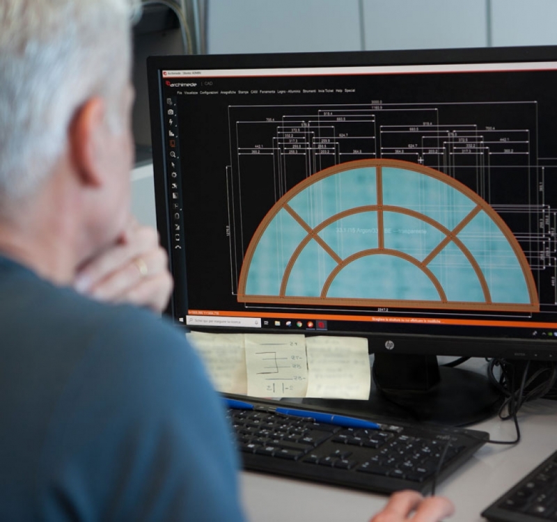 Dopo il rilievo misure avviene la progettazione grafica del serramento mediante software Cad/Cam 3d, lo sviluppo e la pianificazione della commessa. Sugli smartphone in dotazione al personale vengono visualizzate tutte le fasi di lavorazione.